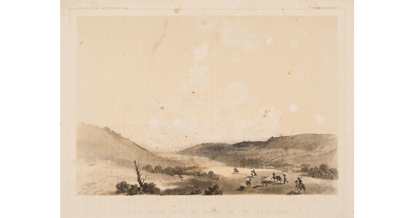 • A color print of a landscape with people near a river and a natural stone bridge towering above.