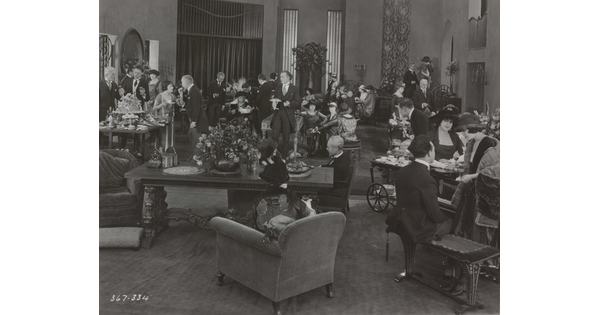 • [Wallace Reid standing in middle of party holding tray, Gloria Swanson and Theodore Roberts to left, "Affairs of Anatol"]