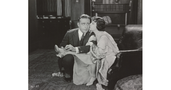 • [Wallace Reid helping Gloria Swanson take off her shoes as she kisses his cheek, "Affairs of Anatol"]