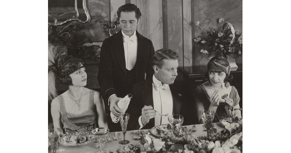 • [Forrest Stanley talking to woman, Theodore Kosloff serving Agnes Ayres, formal dinner scene, "Forbidden Fruit"]