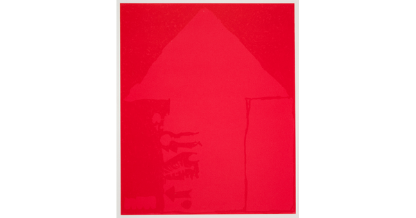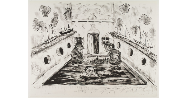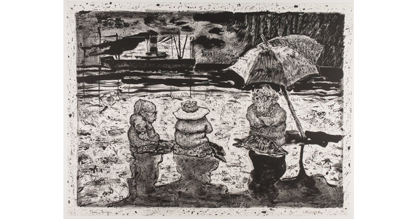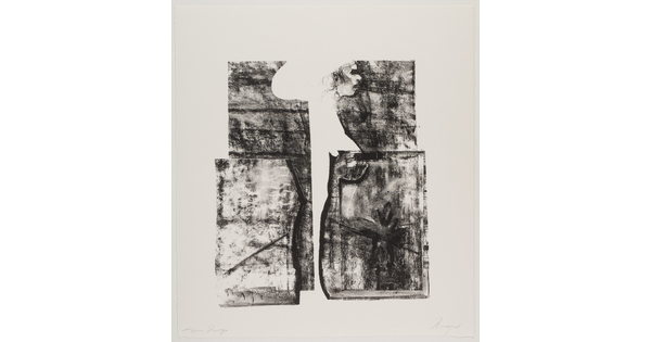 • An abstract black-and-white print of a large organic shape: two upper areas filled with broad, dark strokes; a central area with lighter, thinner marks; and the rest filled with smudges.