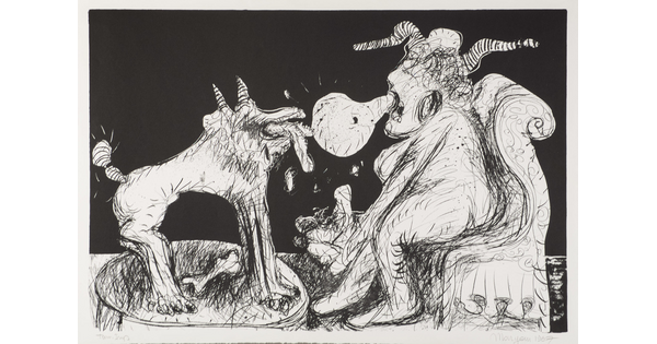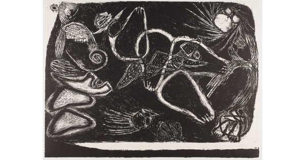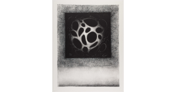 • An abstract color print of a very dark brown splatter shape against a black background.