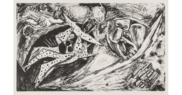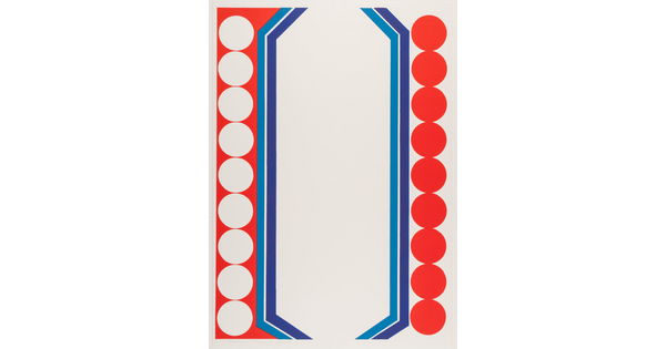 • An abstract color print with a black-and-white design resembling brush strokes, bordered with red and blue lines.