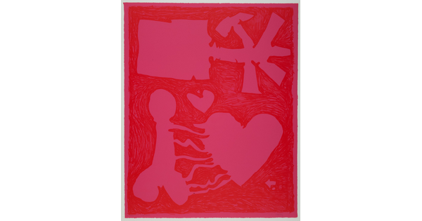 • An abstract color print featuring triangular and spiral shapes in yellow, white, and black on a bright red background flowing diagonally from top left to lower right.