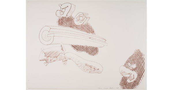 • An abstract color print of a very dark brown organic shape with curled appendages against a black background.