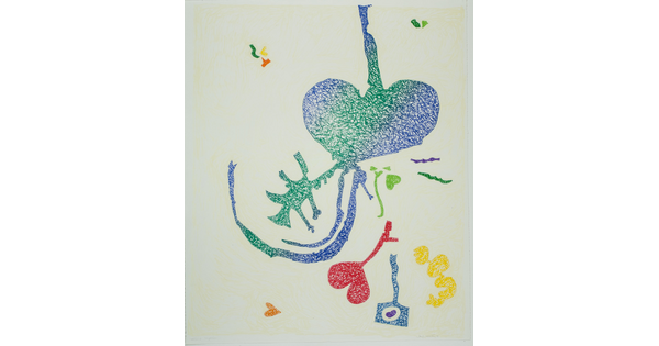 • An abstract color print of organic shapes in blue, yellow, and red that have been made to appear three-dimensional with light green sides.