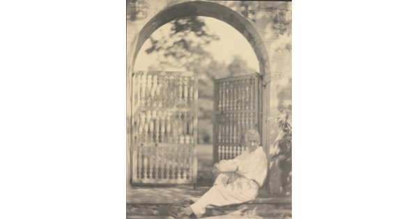 • [Maxfield Parrish, seated by gate]