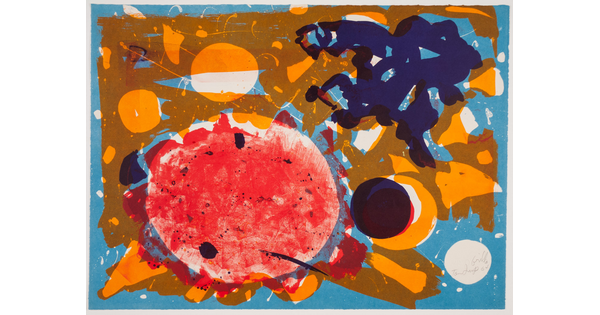 • A color print of a white head in profile surrounded by orange and black brush strokes.