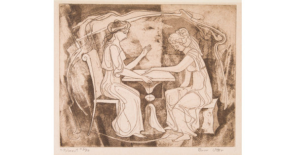 • A black-and-white print of a stylized winged horse and rider viewed from the side.