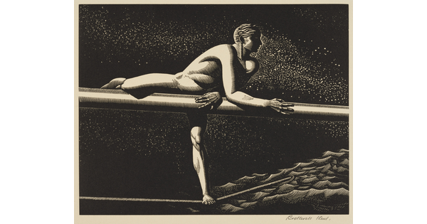 • A black-and-white print of a nude White man, arms and legs wrapped around the mast of a ship, as sunlight shines through the clouds.