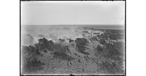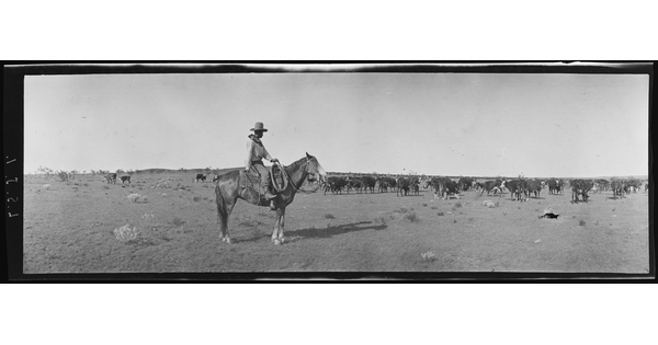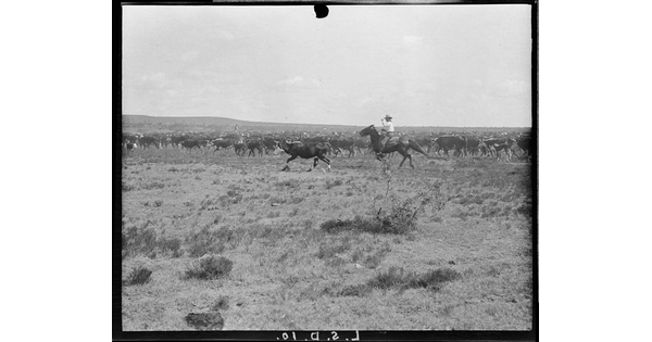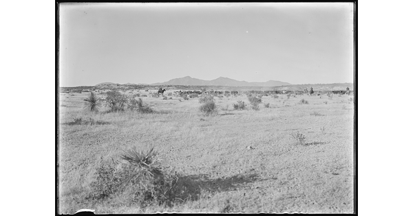 A cowgirl joins the roundup near the Huachuca Mountains. The OR was a part of the holdings of the Greene Cattle Company with headquarters at Hereford, Arizona. OR Ranch, Arizona.