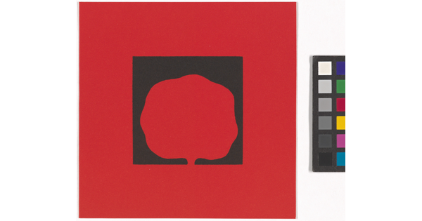 • A black-and-white print of an abstract, tree-like black shape connected to a vertical, wavy black line at the right edge.