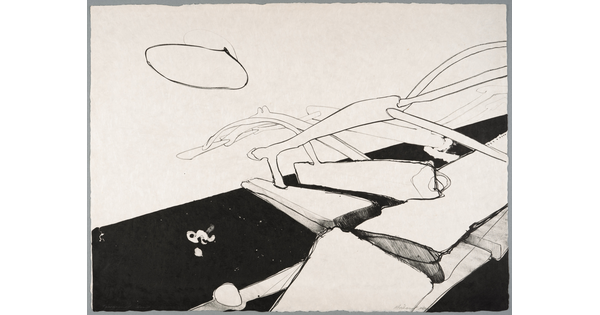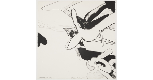 • An abstract black-and-white print of a figure whose head is turned in profile, arms outward.