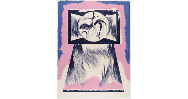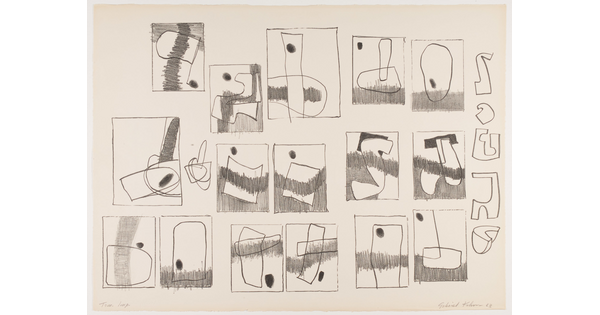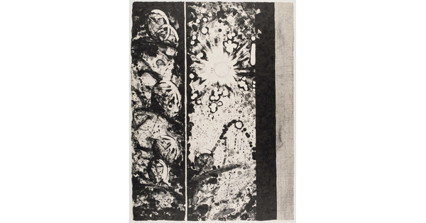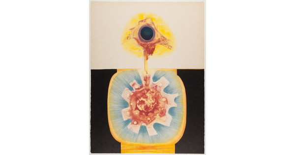 • An abstract color print of a white and black circle with a vertical line through it, phi, and other organic shapes in green, white, and black.