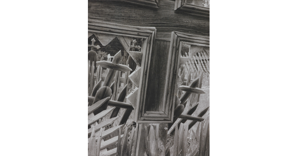 • A black-and-white photograph looking through the windows of a wooden structure onto a cemetery with wooden crosses and fence posts.