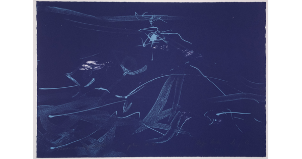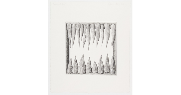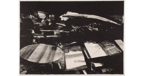 • An abstract black-and-white print of a jumble of organic shapes and rectangles.