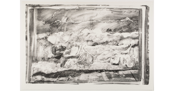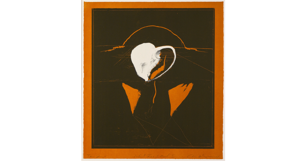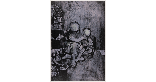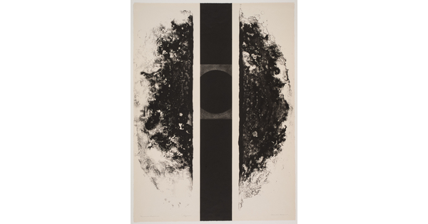 • An abstract black-and-white print of a group of human figures holding up two horizontally-oriented figures and one large figure in front of an orb.
