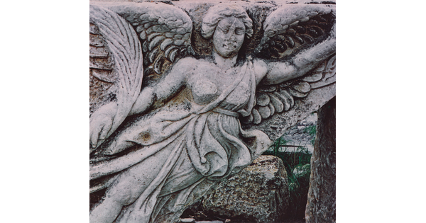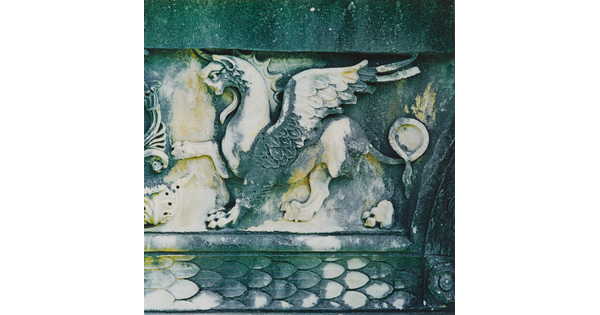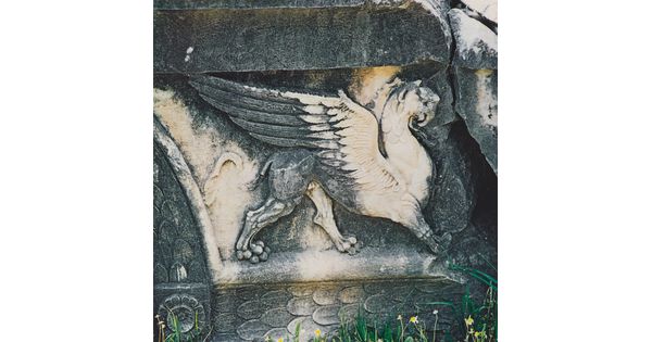 • A color photograph of an ancient stone carving of a woman's face with snakes for hair.