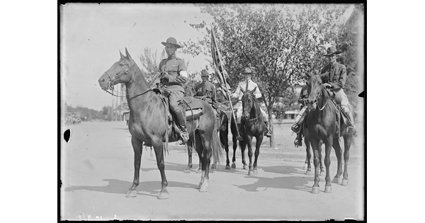 • [Joe Thurmond, mayor of Bonham, leading soldiers wearing World War I uniforms in Bonham parade, Will Evans's party for Fannin County, July 10-12, 1923]