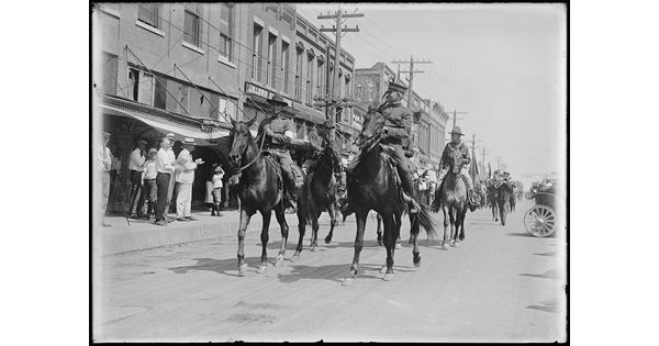 [Joe Thurmond, mayor of Bonham, leading soldiers wearing World War I uniforms in Bonham parade, Will Evans's party for Fannin County, July 10-12, 1923]