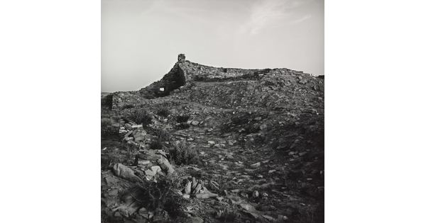 • A black-and-white photograph of cliff dwellings in ruins on the side of a steep cliff.