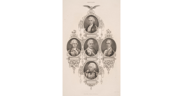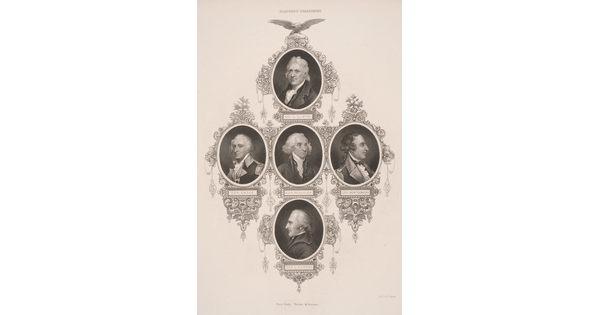 • A black-and-white print of an older White man with chin-length hair wearing a coat and waistcoat; his portrait is surrounded by decorative scrolls and figures.