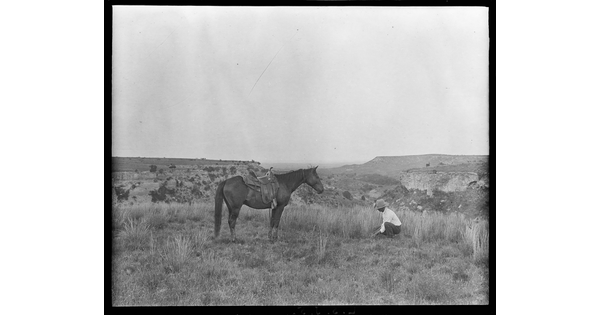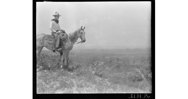 • Erwin E. Smith mounted on a JA pony overlooking the Palo Duro Canyon. JA Ranch, Texas.