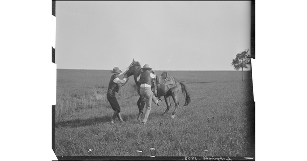 www.cartermuseum.org/.../zack-t-burkett-left-and-monclavio-lucero-right-trying-put-saddle-unbroken-horse-ls
