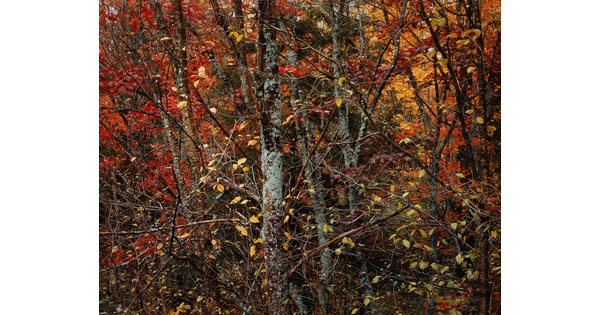 • A color photograph of mostly leafless trees with a few red and green leaves and white blooms scattered throughout the branches.