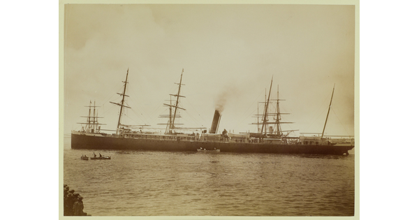 • [Large ship with three small boats alongside]