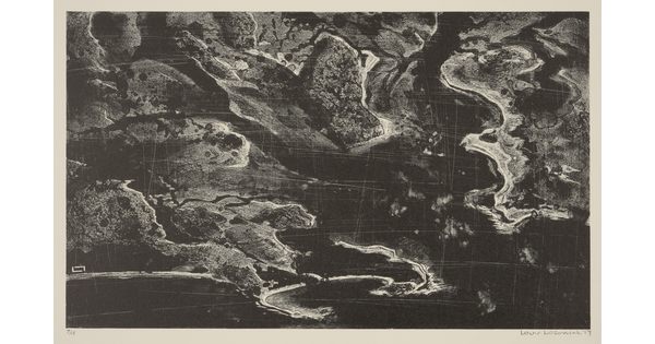 • A black-and-white print of two people walking on a beach among several boats that are aground and wooden dock poles rising up through the sand.