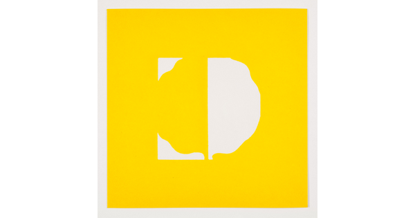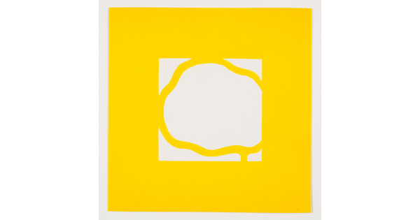 • A color print of an abstract, almost round white shape outlined in yellow and then outlined in white on a yellow background.