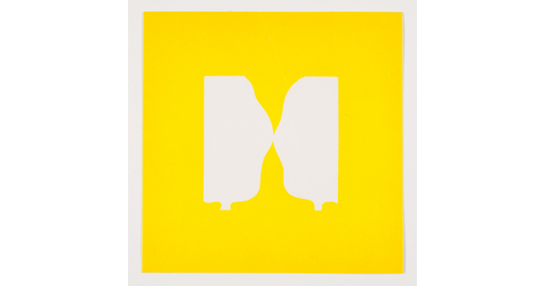 • A color print of abstract, tree-like shapes: on the top, a white shape on yellow, and on the bottom, a yellow outline on white.