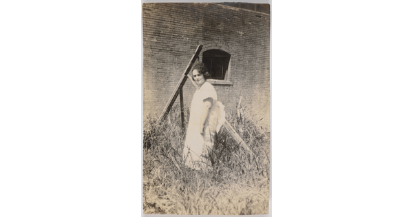 • [Woman standing in tall grass near building]