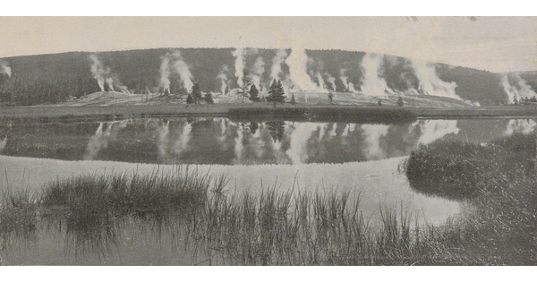 • [Lake with geysers in distance]