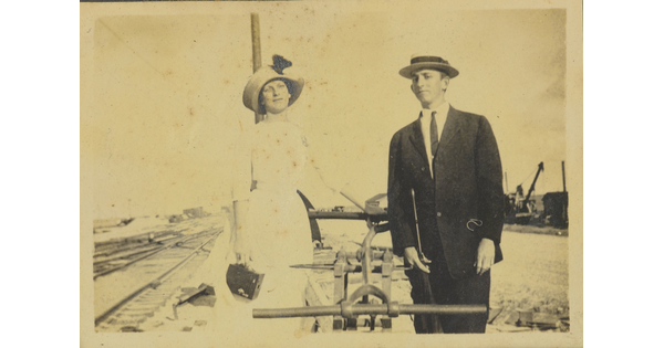 • [Couple standing on hand-powered railroad car]