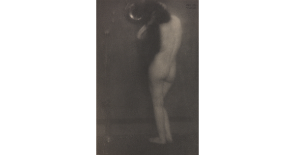 • A sepia-toned photograph of a nude White woman from the back, arms raised to her neck.