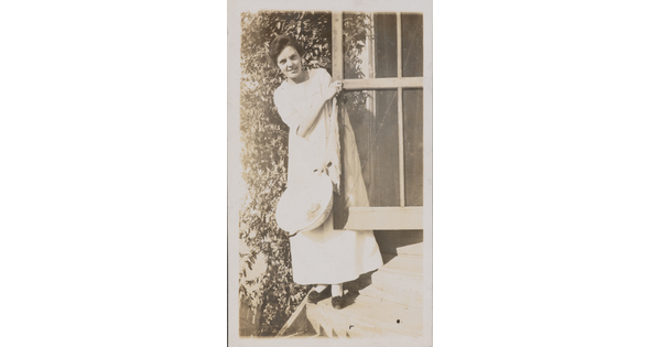 • [Woman standing on steps with large bowl]