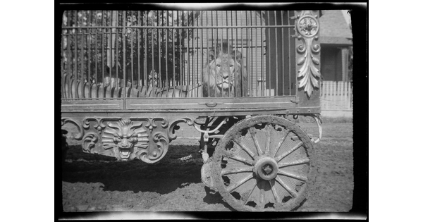 • Photograph of a circus lion, in a highly decorated circus wagon, looking through the bars.