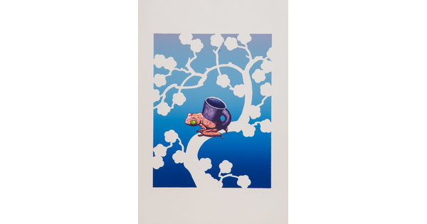 • A color print of a green mug attached to the back of a yellow, red, and gray frog.