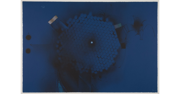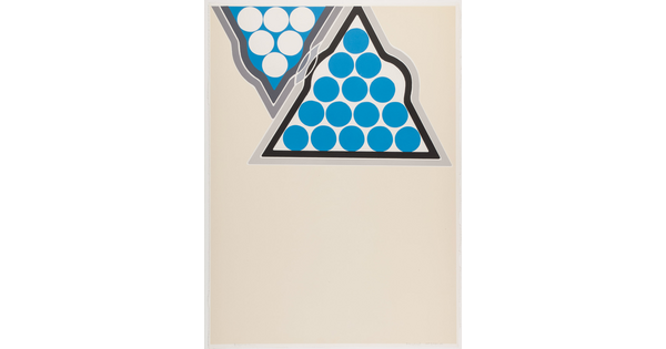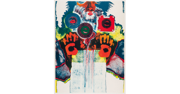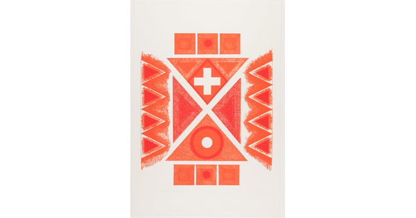 • An abstract color print of a group of children running inside of an arch surrounded by various yellow and gray machine-like shapes.