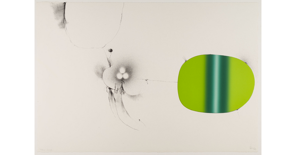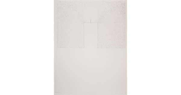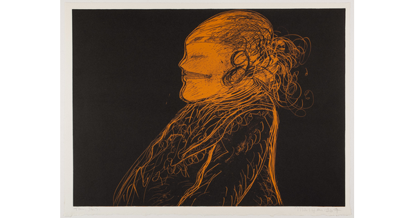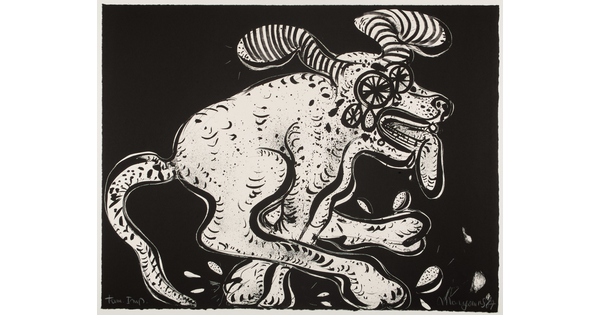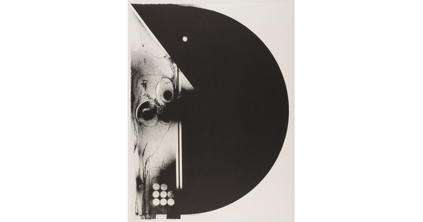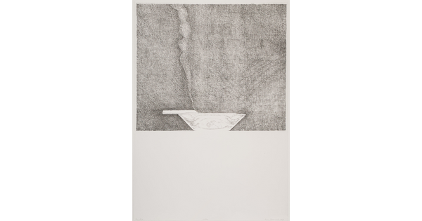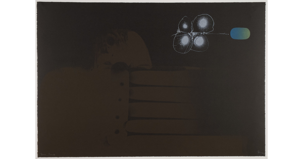 • An abstract black-and-white print of a person sitting sideways on a ledge holding a pole in their hands.
