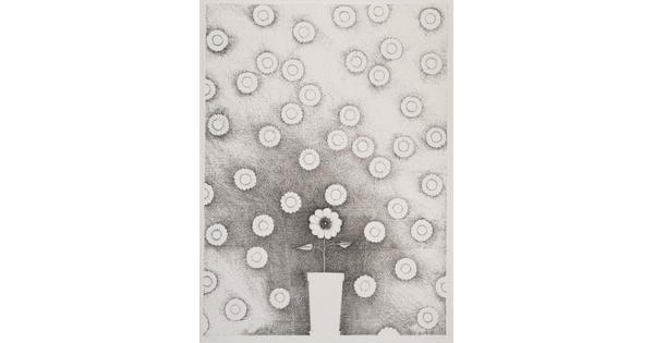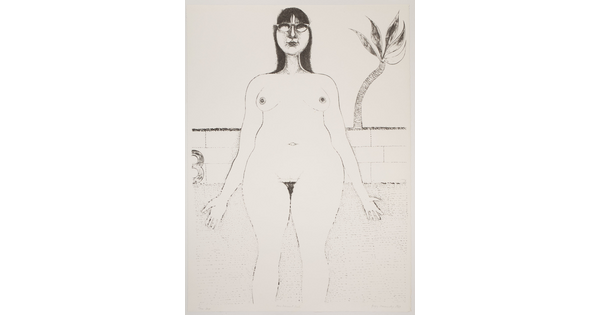 • A black-and-white print of a nude White woman with long black hair holding a flower between her breasts reclining on a patterned surface.