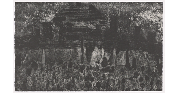 • A black-and-white photograph of a dirt road leading to a multi-story stone-sided structure with a wood facade.