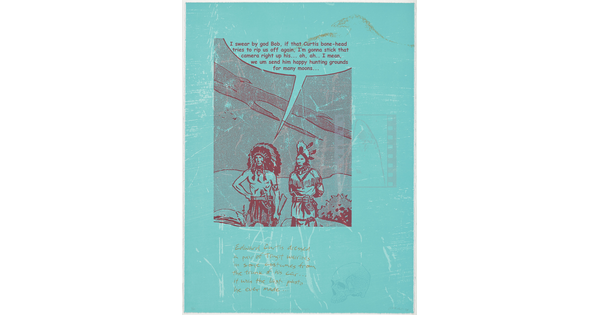 • A color photograph of a cartoon-style Indigenous man punching a White man; the Indigenous man's thought bubble reads, "Your 'Vanishing Indian' paradigm just doesn't fit our Native Epistemology. Here is to deconstructionist theories ..." and the handwritten title beneath the illustration reads, "Tonto gives Edward Curtis a lesson in Native values."