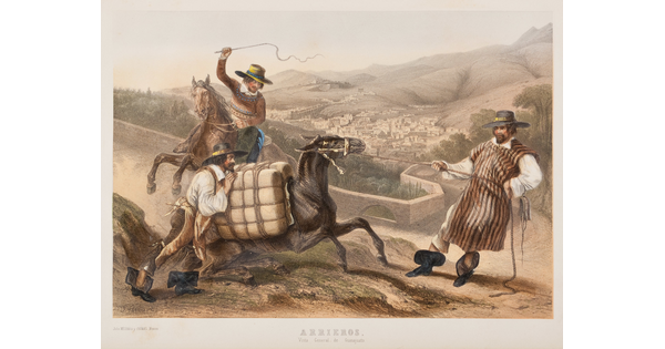 • A color print of four figures, one on horseback, all wearing bright colors and wide brimmed hats, on a hill overlooking a town.
