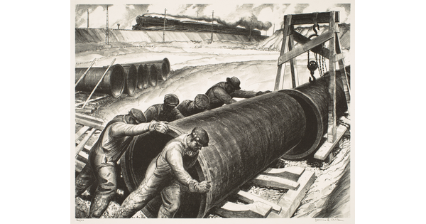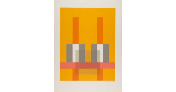 • A stylized print of a weary man pushing a food cart advertising "Red hot franks" and "Lemonade" in front of a geometric cityscape.
