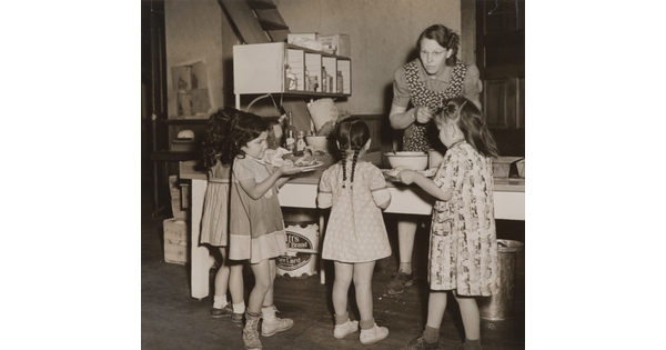 Two sets of flankers and branders working with hot iron, while two cowboys mounted cut out more calves for branding. Teamwork such as this will work a herd very fast. JA Ranch, Texas.