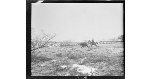 Jimmy Cain of the OR outfit sitting on an "outlaw" while he doctors it. This is near the Southern Arizona border and the longhorns indicate Mexican origin. OR Range, Arizona, Huachuca Mountains.