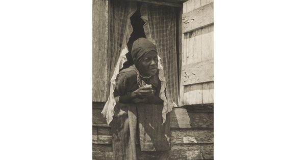 • A black-and-white photograph of a Black woman, head covered in a white kerchief, wearing a plaid dress seated on a wood stoop with her arms crossed on her lap.